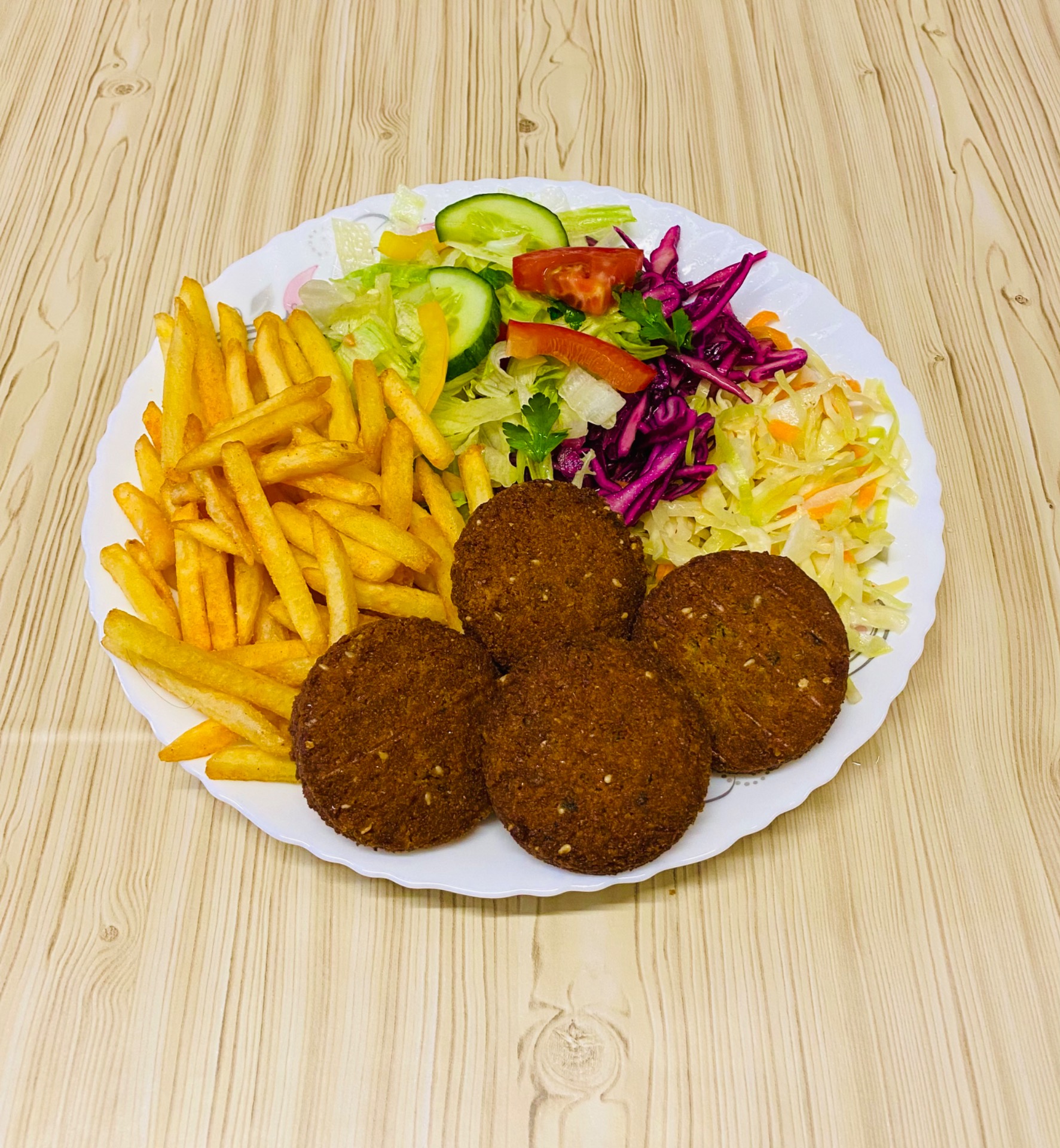 cizrnové karbanátky, salát, dresink s hranolkami, v tortille nebo s tureckým chlebem