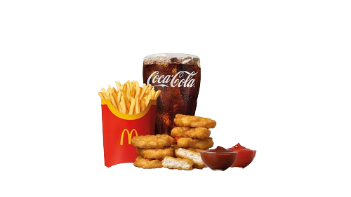 Dozlatova usmažené kousky z kuřecích prsíček. Zvolte si sami velikost porce. Na výběr máte 6 nebo 9 vynikajících Chicken McNuggets. Střední nápoj + Střední Hranolky.