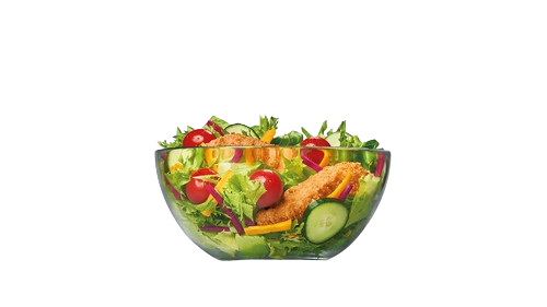 Velká porce nově míchané křupavé salátové směsi. Kuřecí stripsy v křupavé strouhance, čerstvá zelenina, krutony a strouhaný čedar. Se zálivkou podle chuti.