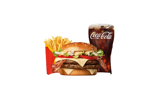 Neodolatelný krasavec s dvojitou náloží masa navíc tě hlavně nasytí, ale potěší i tvé chuťové pohárky. Střední + Střední Hranolky.